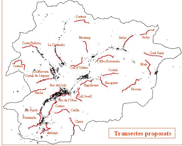 Les espècies a comptar són totes les que es detectin al llarg del transecte, a banda i banda del camí. Els ocells que no s’ha vist que aixecaven el vol ni on aterraven s’anoten com a exemplars que sobrevolen l’itinerari. Els transectes proposats es mostren gràficament al mapa següent. Amb tot, existeix la possibilitat de realitzar itineraris en qualsevol altre indret del país.