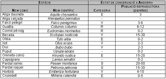 S’ha determinat el seguiment específic de setze espècies. Llur estatus al Principat (segons les categories establertes a Llista Vermella dels Ocells d’Andorra (ADN, 2002)) i l’estima de la població reproductora d’Andorra (BirdLife International, 2004) es recullen a la taula següent: